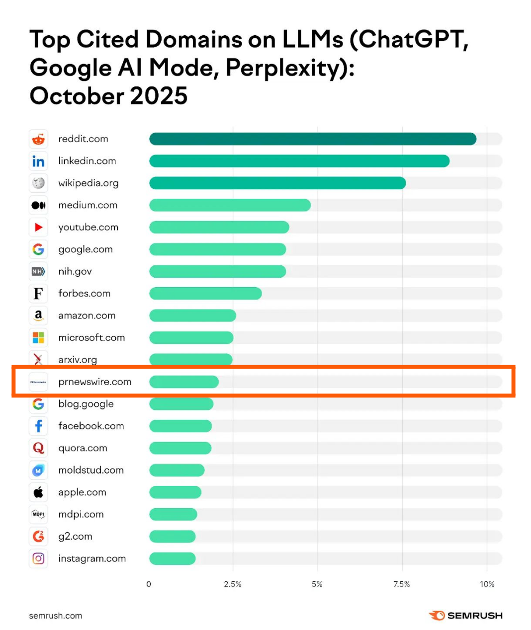 PRNewswire.com ranks #12 among the top 20 most-cited domains across major LLMs. alongside other leading domains like Reddit, Forbes, Wikipedia, G2, etc