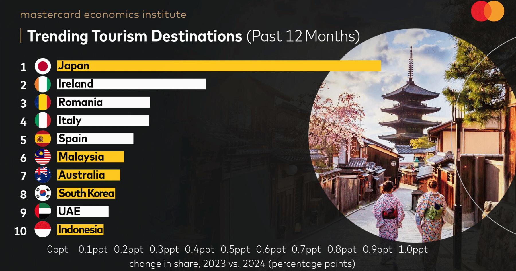 This release from Mastercard on their Travel Trends 2024 report stresses one of the key findings in the headline: “Home to half of the world's top 10 trending tourism destinations, Asia Pacific is making a comeback”. The infographic as seen below, features an eye-catching ranking display, which further highlights APAC's tourism boom over the past year.