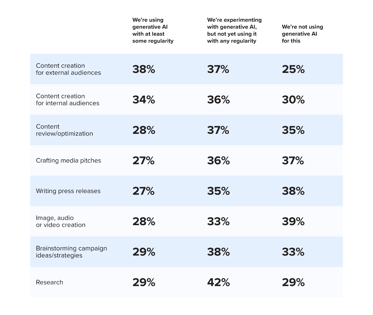 APAC appears to be the region that’s furthest along in its generative AI journey. In four of the eight use cases given, more than half of respondents said they were using the technology regularly: content creation for external audiences (63%), crafting media pitches (52%), writing press releases (51%), and image, audio or video creation (52%).”