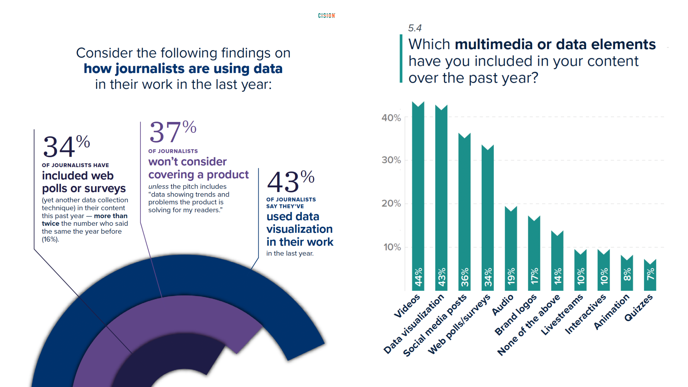 It is said that “a good infographic is worth a 1,000 words”, and the statistics do back this up! Our 2023 State of the Media Report found that journalists love to use infographics in their own works. 43% of them included data visualizations in their content over the past year, whilst 34% have used web polls or surveys as data collection techniques.