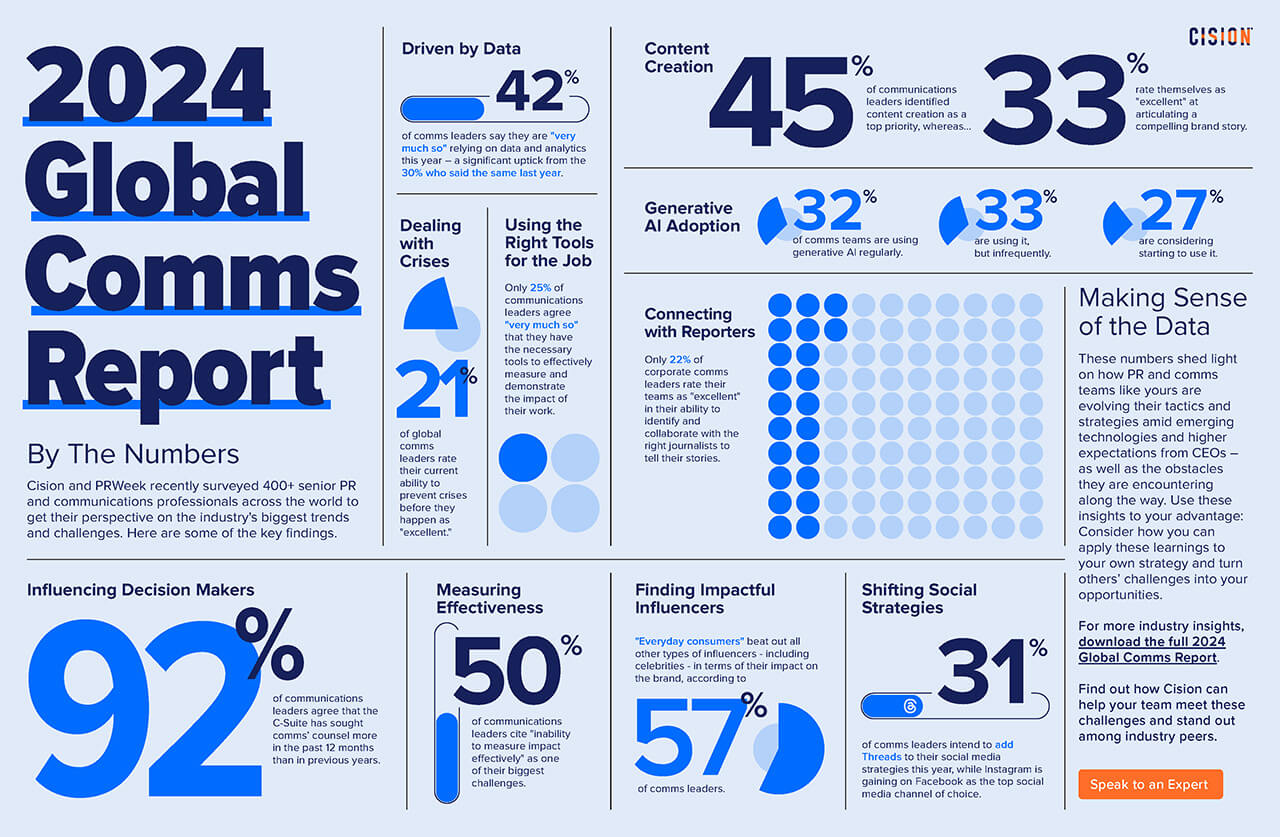 The 2024 Cision and PRWeek Global Comms Report surveyed more than 400 senior PR and communications professionals across the world to get their perspective on the industry’s biggest trends and challenges.