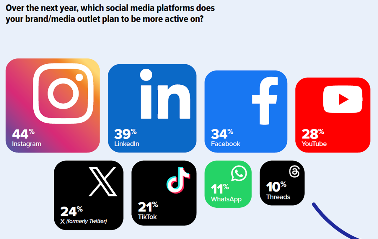 When asked which social media platforms their brands planned to be more active on, the most popular response was Instagram (named by 44%, ahead of LinkedIn and Facebook).